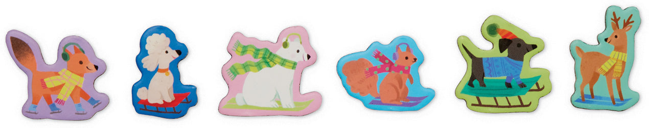 Race across the snow to the hot cocoa stand with this simple magnetic game that's perfect for on-the-go winter entertainment. Players choose a snow day-ready character like a squirrel on skis or polar bear on a sled. Then take turns using the attached spinner and moving to the next shape that matches on the colorful path. Get lucky if you land on a "spin again" or "jump to", but watch out for "lose a turn" spots! The first player to arrive at the hot cocoa stand wins. For 2-6 players.