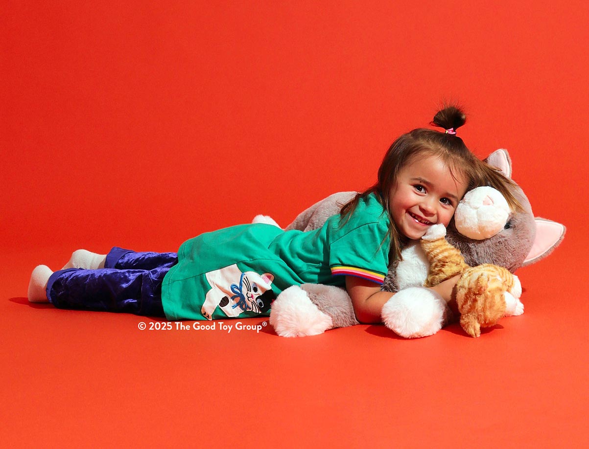 Calling all grandparents: here's a gift that wows! This super cuddly jumbo plush cat is ready for years of memory-making adventures! Stretching 30" in length, Boots the grey and white cat is bright-eyed and ready for full-bodied hugs. Kiddos are drawn to her size, bright blue eyes, pink ears and nose, and sweet softness. Boots will look great lounging under a tree on Christmas morning, and will leave kids awestruck as they pull her out of a giant gift box!