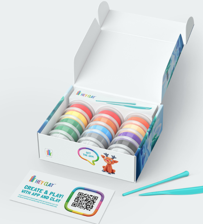 Sculpt like a pro and enter a winter wonderland! Creative kiddos gain confidence, build fine motor skills, and sculpt the snowy scenes of their dreams using this frustration-free HEY CLAY kit. They're set up for success using non-sticky air-dry clay and an entertaining app that helps to build each character step-by-step in a simple and fun way. Everything's included to make 6 festive characters using 15 colorful cans of air dry clay and 2 tools. From Santa and Mrs. Claus to a happy Christmas Tree and a penguin in a hat, their creations dry in a couple of hours. Use the figurines for imaginary play adventures... or give them to loved ones as gifts!