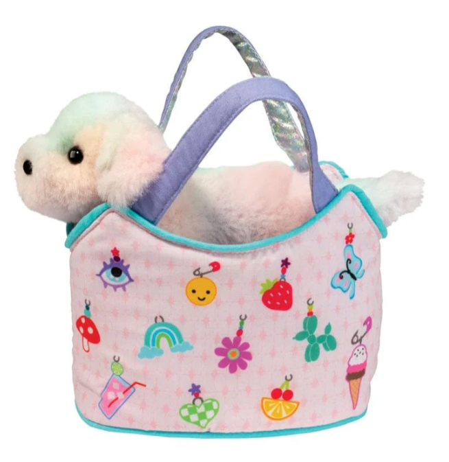 The Douglas Charmingly Yours Sassy Pet Sak features a soft plush Rainbow Dog tucked inside a colorful, playful bag. Perfect for cuddles, imaginative play, or display, this adorable companion brings fun and cheer to any collection.