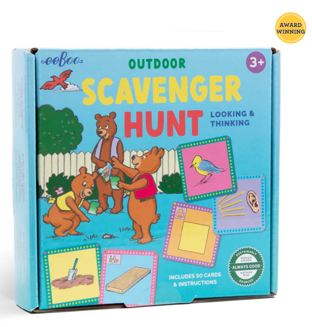 Outdoor Scavenger Hunt is a finding game, not a gathering game, inspiring flexible, cross-categorical thinking while developing observational and analytical skills. Adaptable to any climate, children search for common objects or their attributes—color, size, material, texture, pattern, sound, smell, number, or resemblance.  Artwork by Saxton Freymann.