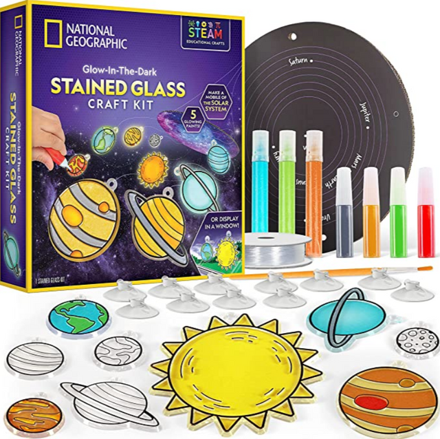 EVERYTHING KIDS NEED – This fun and educational arts and crafts kit contains an acrylic sun and planets, glow-in-the-dark and metallic paints, plus suction cups and hanging supplies to use as window art or as a hanging mobile!