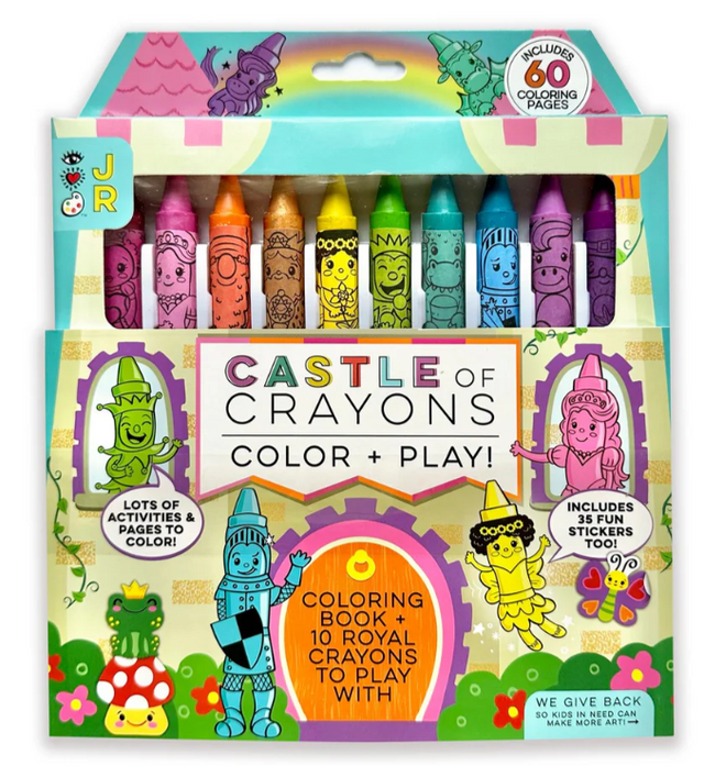 This box of chunky crayons gets the royal treatment! Adorable castle-shaped package holds 10 crayon characters including a princess, knight, dragon, fairy and unicorn for ages 3+! Color the 60-page coloring book and use it as a backdrop to play with your crayon characters! Also includes 2 sheets of stickers to decorate your artwork. Engage in Social Emotional Learning as you learn about each character’s world and favorite things.