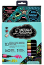 Let their creativity shine! Artistic kiddos design shimmery artworks using 10 metallic brush tip paint markers on a black paper pad. It's easy to create masterpieces on all 50 pages with freehand drawing or using the included stencil sheet. Perfectly packaged for on-the-go creativity.