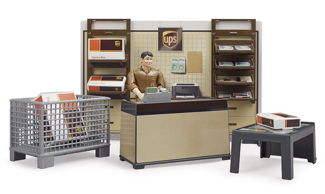 UPS, one of the world's leading shipping service providers, offers its customers more than just parcel shipping. The UPS Stores give customers the opportunity to use services such as print services, post boxes and of course UPS's worldwide shipping solutions. Bruder now also has the UPS Store with equipment and figure. Parcels can be picked up and dropped off here, shipping boxes can be bought and other services can be used. The employee included in the set is happy to help. The UPS Store is the perfect addition to the UPS vehicles from Mercedes (item no. 02678), Mack (item no. 02828) and Scania (item no. 03582) already in the Bruder range. And of course, the UPS parcel shop can be easily combined with the other bworld theme sets.