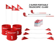 Includes: 3 pop up buckets(holes), 3 flagsticks, 6 balls, 3 tee boxes, carry bag, 3 scorecards, AND 2 super portable collapsible clubs (adult size only - not adjustable)