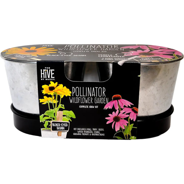 Pollinator Garden Grow Kit- (Black-Eyed Susan, Coneflower) includes 2 metal galvanized pails, metal tray, 2 wooden markers, chalk, seed packets, growing medium and growing instructions