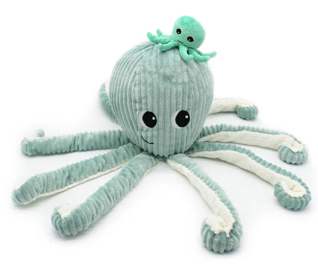 The 45 cm octopus mother and baby plush toy is mint in corduroy and soft.