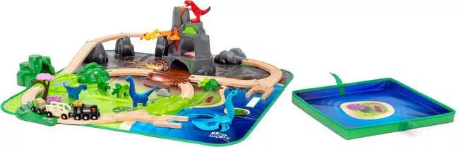 Explore the world of dinosaurs in the 36104 Dinosaur Deluxe Set. This 45-piece train set is a Jurassic-jungle of fun and storytelling, complete with a volcano that erupts with lights, sounds and realistic steam-effects. Join 8 playful dinosaurs that come in a variety of vibrant colours and offer unique functions like movable limbs and classic BRIO magnets to interact with the world around them. This set also includes a handy storage box that unfolds into a play mat for more immersive dino-adventures.