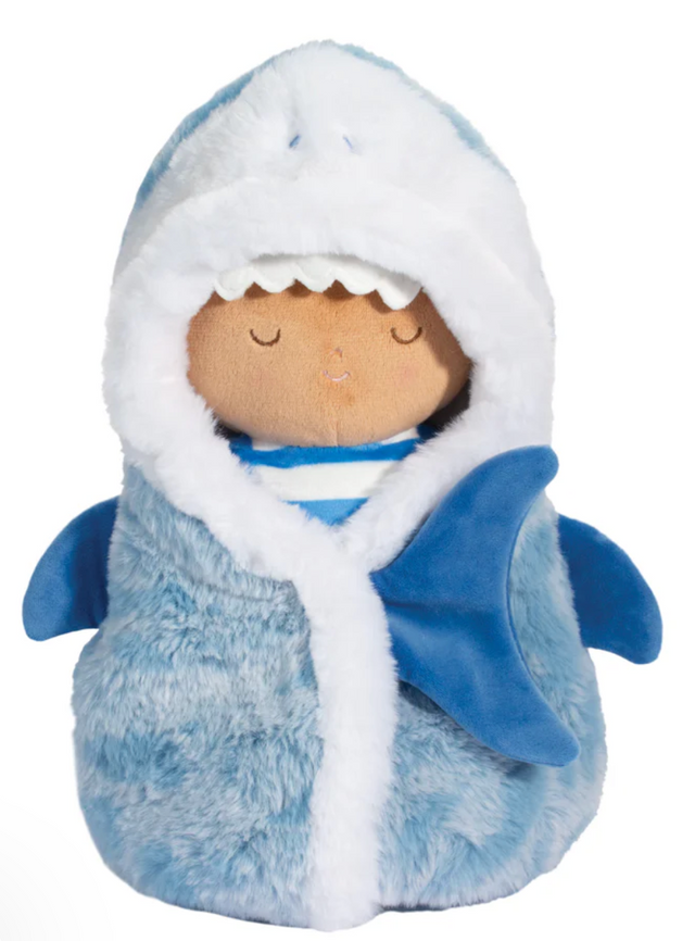 Baby shark, doo doo doo doo doo doo! This soft baby doll plush is a fin-tastic gift for summer newborns. An innovative spin on soft dolls, this snuggly friend comes swaddled in a removable shark-themed blanket. We love the tail fin closure, embroidered felt teeth, and extremely soft pastel blue and white material. The plush blonde baby doll is wearing a striped blue and white onesie, and is ready for hours of interactive play!