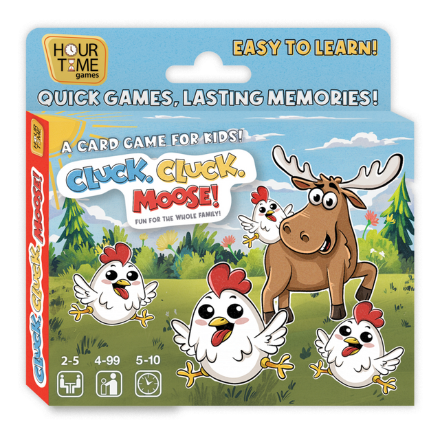 CLUCK, CLUCK, MOOSE was created to be a delightful twist on a classic children’s game. Young children, even pre-schoolers as well as older siblings,parents and grandparents will all enjoy a memorable time bonding over the fast and fun gameplay.