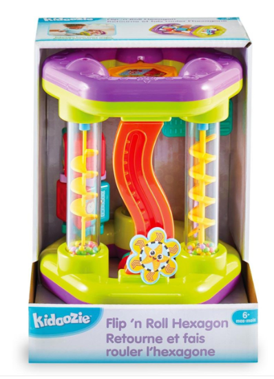 Unique, hexagon-shaped toy offers 6 sides of activities for babies. Features engaging elements to twist, turn and explore. Beads cascade down the columns, creating soothing sounds. Place upright while a child is in a seated position, or on its side for tummy time play. For ages 6 months and up.