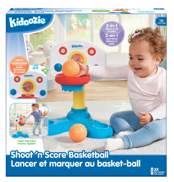 Height adjustable toddler basketball set. Can be adjusted 17"-19" inches tall to grow with your child. Motion detector sense every time a basketball is scored with light and sounds action. Includes 2 mini basketballs which can be stored on the base. Requires 3 AAA batteries not included.