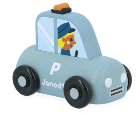 Turn on the flashing beacon and get to work!" This little wooden car is suitable for children aged 12 months and over. In its characteristic blue color, this is a lightning-fast police car, with a policeman on board, always ready to protect the inhabitants! Its shape has been specially designed for little hands, who can easily hold it by the top to roll it along. The vehicles are perfect for inventing stories and developing the imagination! Babies first have fun rolling them, then older children can tell all kinds of adventures and develop their vocabulary and creativity.