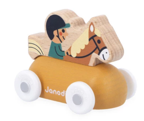 "Let's go for a fun ride on horseback!" This little wooden vehicle is suitable for children aged 12 months and over. With his rolling horse, this rider travels across snowy plains and small paths in the forest! Its shape has been specially designed for little ones, who can easily hold it by the top to make it roll. The vehicles are perfect for inventing stories and developing imagination! Babies first have fun rolling them around, then older children tell all kinds of adventures, developing their vocabulary and creativity.