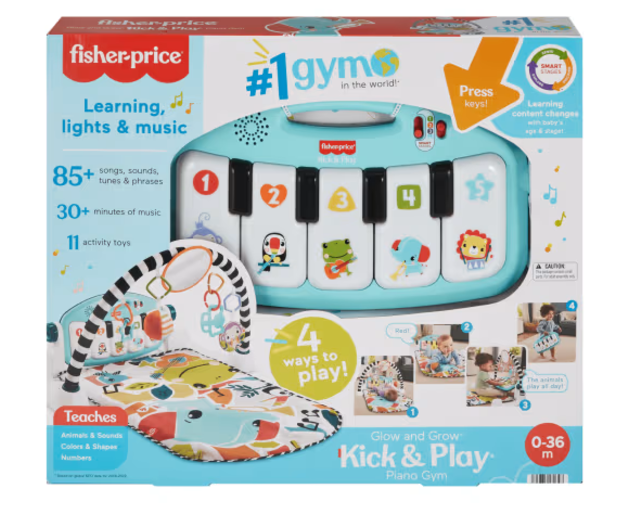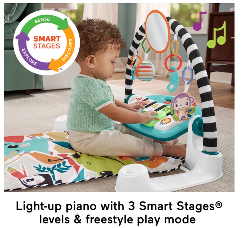 Get your little one moving, grooving (and learning) with the Glow and Grow Kick & Play Piano Gym from Fisher-Price. This soft baby activity mat features a repositionable high contrast toy arch with 10 linkable toys. The removeable piano with 5 light up keys features a multi-colored light show and has 4 musical settings that grow with baby from newborn to toddler. With 3 Smart Stages learning levels, and a bonus freestyle mode with real piano notes, you can keep things fresh and fun as your little virtuoso goes from lay and play and tummy time to sitting up and making music!