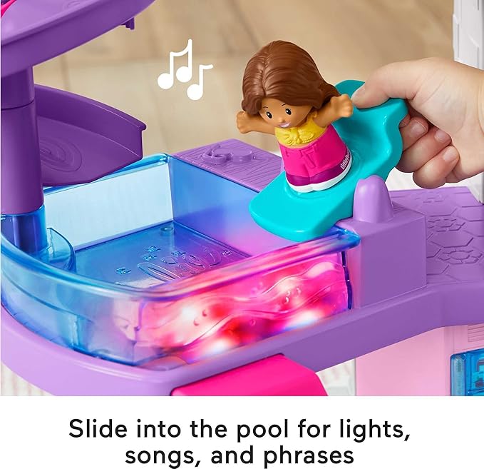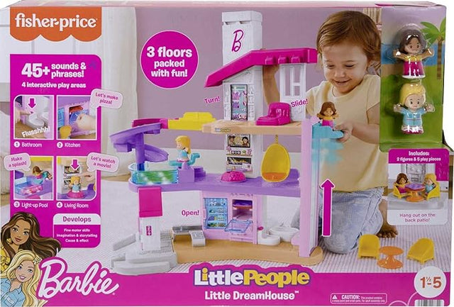 Toddlers can explore the iconic Barbie® home, sized just right for their little hands and packed with toddler-friendly pretend play, with the Barbie® Little DreamHouse™ interactive playset by Little People®. Featuring 3 floors of play, this playhouse is loaded with hands-on fun, including a moving elevator, rotating clothes-closet, a light-up pool with slide, and 4 activation points for kids to press for fun lights, music, and realistic sounds.