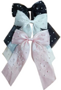 These hair bows are all the rage! These are chic chiffon with pearls. These have an alligator claw. The bow width is 7" and the tail length is 8". They are just perfect!!