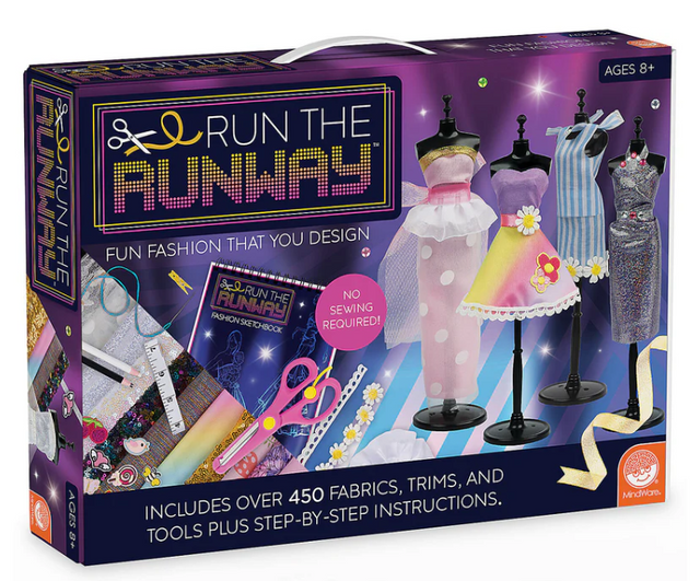 Aspiring fashion designers, bring your clothing creations to life! This comprehensive fashion designer set includes over 450 fabrics, a versatile sketchbook, easy-to-follow dress patterns and essential design tools to turn your vision into reality — all with no sewing required. Tailored for various skill levels, you can sketch your dream dresses, use the patterns to shape fabrics and display your masterpieces on mini mannequins, using the custom backdrop on the box to set the stage for a dazzling fashion show. Browse the robust guidebook to catch a glimpse into the fashion design profession; learn fundamental design skills like sketching ideas, adding details, layering fabrics and basic sewing skills and discover cool fashion design tricks like making a mood board, measuring in heads and more.