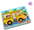- 6-piece wooden peg puzzle plays verses of The Wheels on the Bus when pieces are lifted