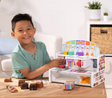 Sweeten up playtime for imaginative kiddos by putting them behind the counter of a chocolate factory! This interactive wooden playset features an intuitive design, empowering kids to order, assemble, display, and sell pretend play candies. They'll flip switches, slide a conveyer belt, drop wooden fillings and plastic coatings down chutes, and box up their creations! Complete with stickers and play money to elevate the fun, this set allows kiddos to mix and match 6 bases, 6 tops, and 6 fillings for countless creative combinations. Great for color matching, counting, and developing language skills through cooperative play.