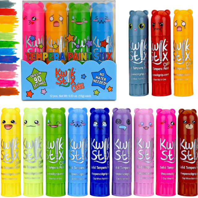 The amazing Kwik Stix Solid Paint Sticks you know and love-now with adorable personalities! A must-have for every craft supply kit, these personality-packed tempera paint sticks unlock endless creative possibilities. Perfect for posters, cardboard, wood, canvas, rocks, and even windows, Kwik Stix Cuties are designed and ideal for all kinds of art projects - and they wash off easily from hands, clothes, and most surfaces making cleanup a breeze after every creative session! No cups, brushes, or water needed! These vibrant, mess-free paint sticks dry in under 90 seconds, making creativity clean and stress-free. This set includes 12 highly pigmented, easy-to-hold sticks (3.5" x 0.75") - just right for little hands. Plus, we love the Kawaii-inspired character designs that support socio-emotional learning, empowering children to express themselves confidently and artistically.