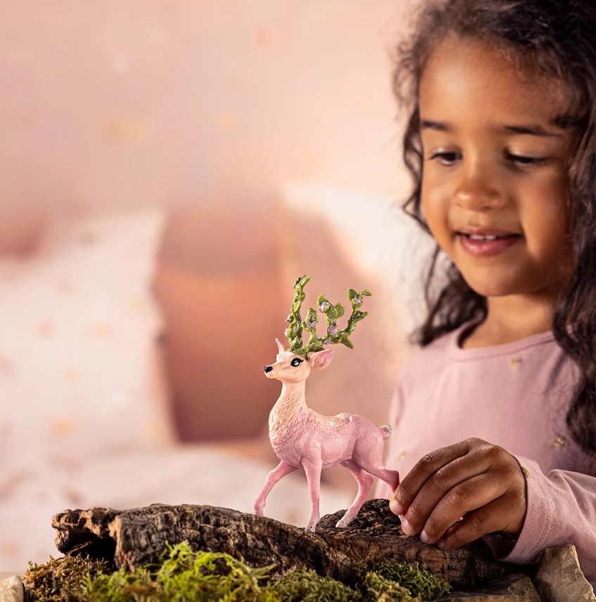 When the Magic Deer appears in the forest of BAYALA®, it commands everyone's attention. How beautiful the golden antlers shimmer in the sun. They are decorated with roses to match the deer's pink coat. It has a pretty mandala on its forehead. Its chest and hooves are dusted with glitter, which reflects the sun's rays. Simply magical!