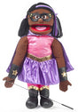 This NEW fullbody puppet stands 25 inches tall and comes dressed as shown. Only the cape and mask on this puppet are removable. Insert your hand into the slot in the puppet's back to operate the mouth. Included is one arm rod which can be clipped to either hand for movement .25In Superhero Girl (Black) Silly Puppets