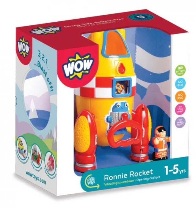 Ronnie Rocket Space Rocket toy is out of this world! Pull Ronnie’s cord to start the countdown! His window numbers go from 5 to 1 while Ronnie shudders and shakes as he approaches blast-off. Push the WOW button to open the cockpit, then place his Astronaut Play Friend inside to send Ronnie flying into orbit on a daring space mission!