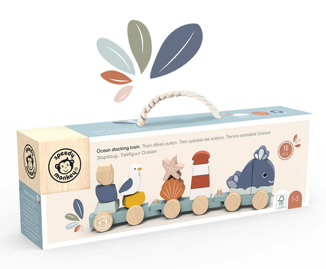 Crafted from FSC-certified wood and finished with child-safe, non-toxic paints, the Ocean Stacking Train is sturdy, eco-friendly, and safe for play. Plus, cleanup is a breeze, just wipe with a damp cloth.