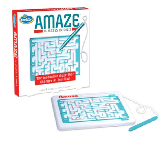 A maze that changes every time you play! Players must navigate this maze game using the attached stylus, pushing open movable gateways while avoiding traps and dead ends! An innovative twist on a classic maze game, Amaze’s diabolical shifting pathways change the solution path during play! With 16 unique challenges and no pieces to lose, Amaze is the ideal travel game!