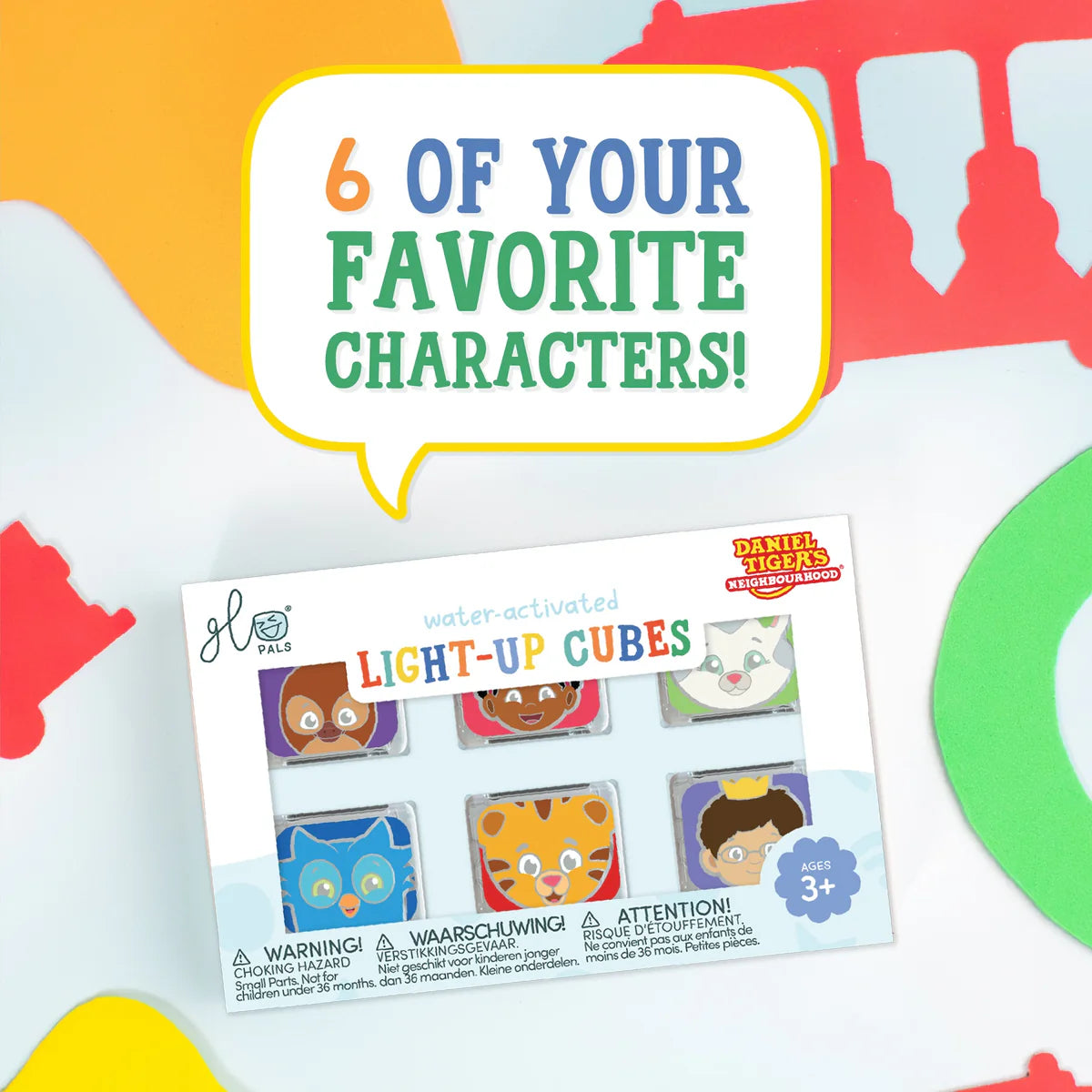 NEW! Transform playtime into a Grr-ific adventure in the Neighborhood of Make-Believe with Glo Pals Light-Up Cubes, featuring six friends from Daniel Tiger's Neighborhood! Each Light-Up Cube glows like magic when dropped in water, then automatically turns off when removed. Purr-fect for bath time and water-based sensory activities. 🐯