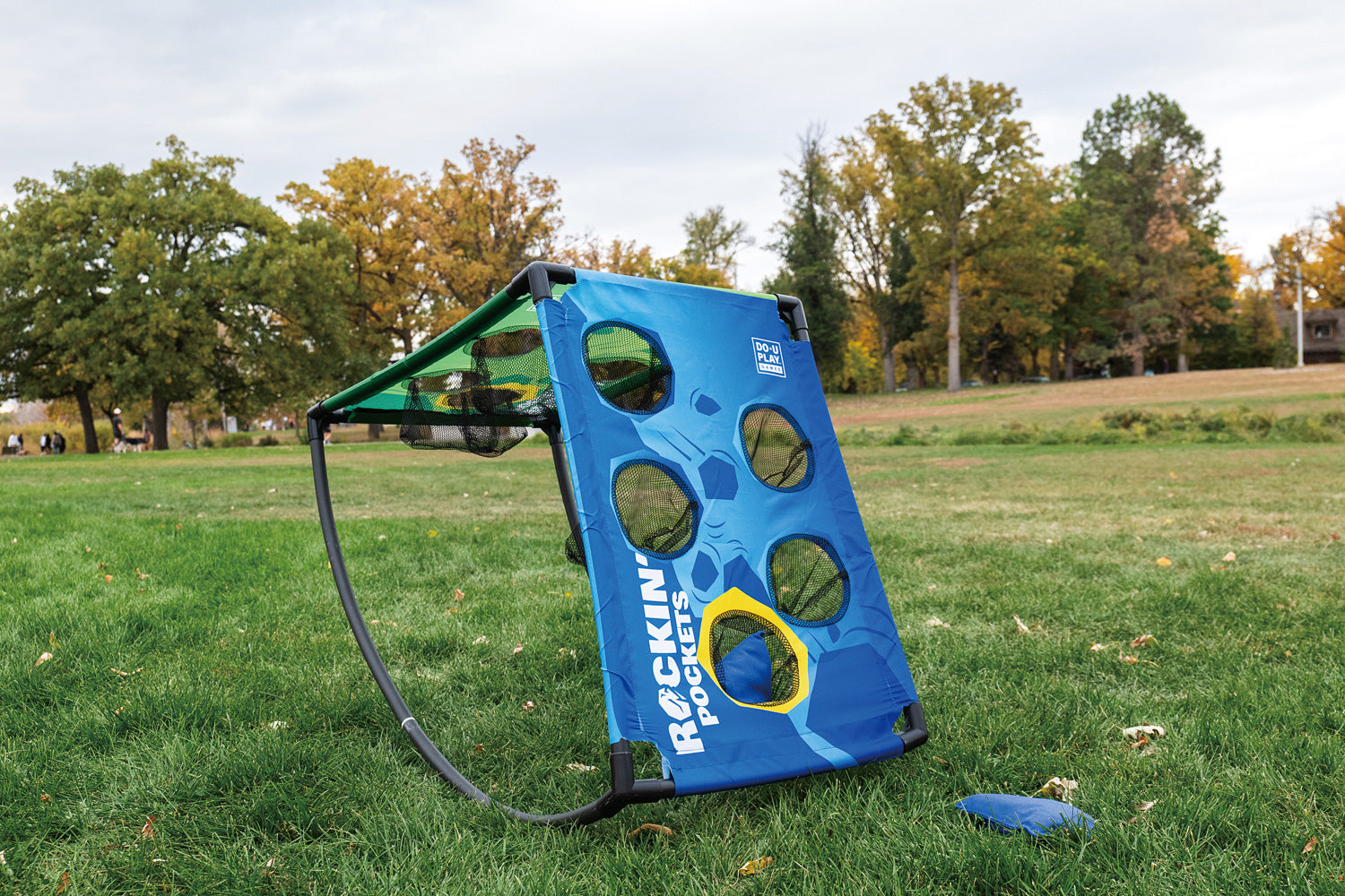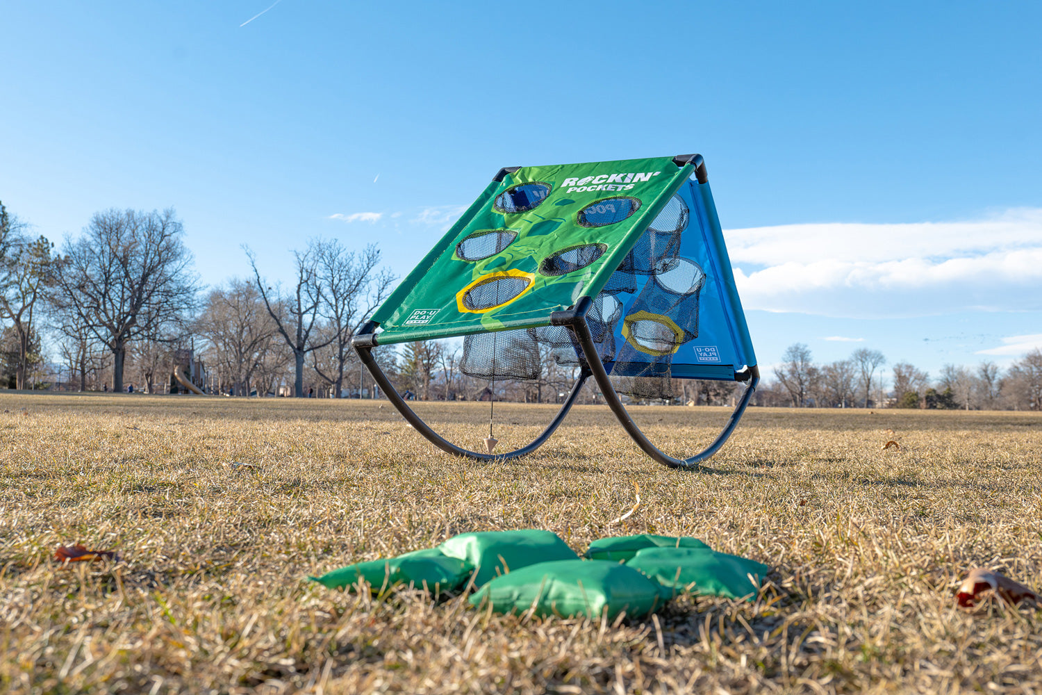 Inspired by the classic game of cornhole, Rockin' Pockets introduces an exhilarating rocking mechanism to amp up the fun indoors or outdoors. Players face off from opposite sides and simultaneously toss their 6 bags towards the pockets. Each successful throw tips the scale, causing the target to rock towards the player's direction. The last bag is twice as heavy, so throw carefully! Points are scored based on the target's leaning angle after each round and the first player/team to 25 points wins. For 2-4 players.