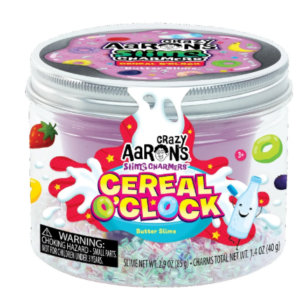What time is it? It's Cereal O'Clock, of course! Get ready for a bowl full of fun with this smooth, fuit cereal scented, purple butter slime. Crazy Aaron's® Cereal O'Clock Slime Charmers(tm) comes with white bingsu beads for the perfect crunchy texture and cereal-themed charms to mix in. Squish, stretch, and swirl your way to a playful slime adventure that's as fun as your favorite breakfast!