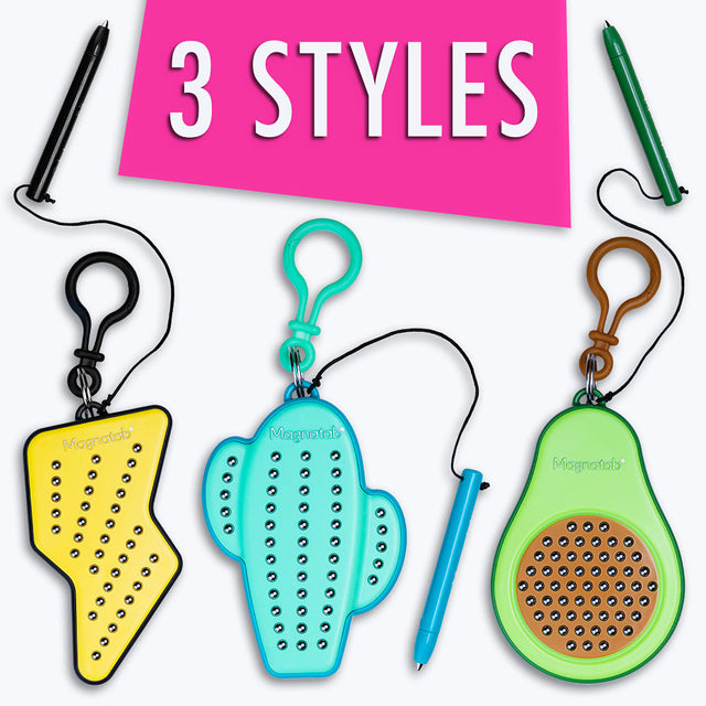 Discover magnetic fidget fun on the go! With a simple keychain clip design, these adorable fidgets are perfect for all ages. Use the attached stylus to pull the magnetic beads to the surface with a satisfying pop. Create designs and then reset them by running a finger across the surface! Available in three shapes: avocado, cactus, and lightning bolt. Each sold separately.