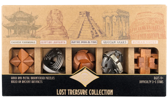 Challenge the PhD in your family with this set of 5 brainteaser puzzles inspired by ancient artifacts! Each challenge is solved in a completely different way with a range of difficulties. Themed to take puzzlers on a journey through Chinese, Egyptian, Aztec, Grecian, and Roman civilizations, these brainteasers make beautiful desk toys or fidgets for teens and adults.