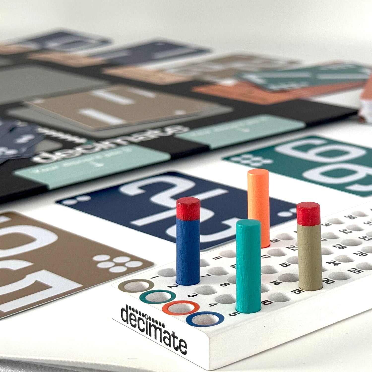 The player who depletes their Decimate Pile first ends the round, but all players get points based on how many cards they played into the Build Piles, so anyone can win. Players track their points on the nifty, tactile 10x2” deluxe wooden scoreboard. Whichever player reaches 100 points first, wins!
