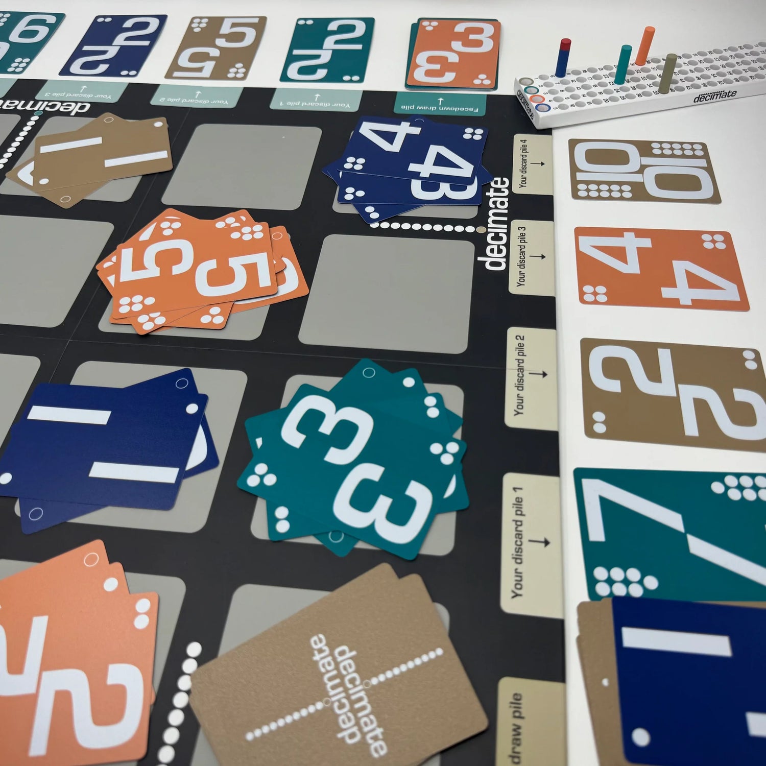 With constant, frenetic, fast-paced action, 2-4 players must successfully redistribute their Decimate Pile into the 16 Build Piles of zero-to-10 cards in four colored suits onto the huge 20x20” gameboard.