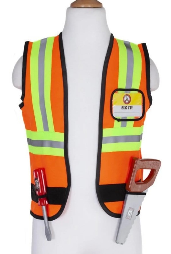 Build your heart out! This construction set has you prepped and ready for the job and looking the part in this complete 7 piece dress-up-and-play set. This set includes an orange vest with reflective stripes, a hard hat with decal, play plastic a hammer, a play plastic mini saw, a play plastic screwdriver safety goggles, and a name tag so everyone at the job site knows who you are. All our Great Pretenders Career Costumes are packaged in a reusable blue garment bag for easy storage. 7 Piece Set: reflective orange vest, tool belt, hat, hammer, screwdriver, name tag and saw.