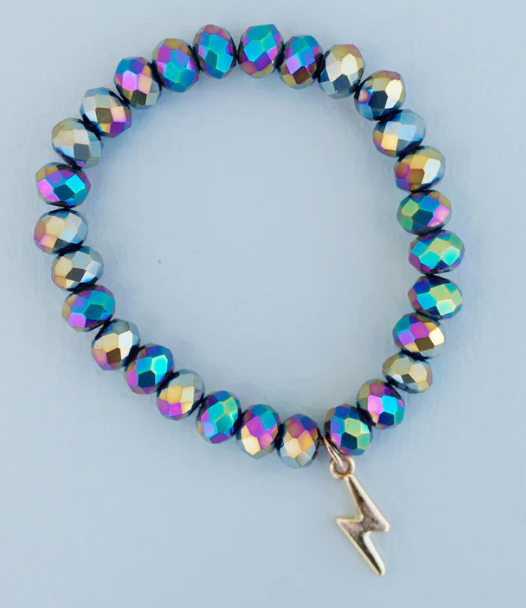 Superhero meets fashion! Our Lightning Bolt Revolt Bracelet holds a dark holographic pattern and a gold lightning bolt charm, and looks especially cute with our matching Lightning Bolt Revolt Necklace.