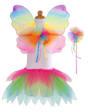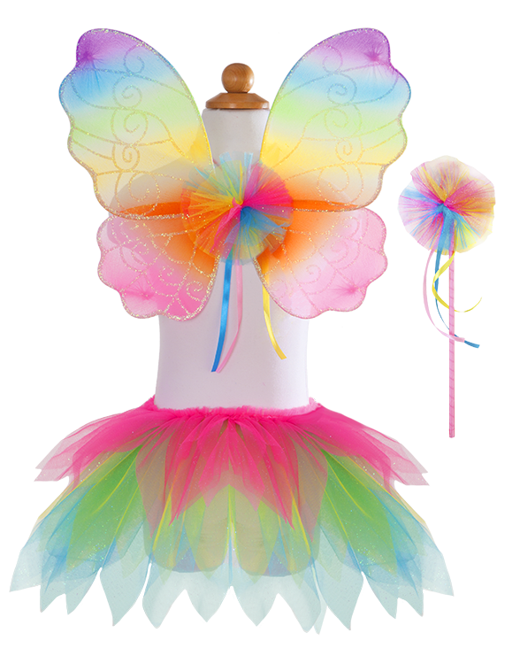 Somewhere over the rainbow you'll find the perfect tutu, wing and wand set! This skirt set is made from soft glitter tricot tulle cut to be petal perfect. The matching rainbow wings feature an amazing glitter print that is sure to sparkle and the rainbow wand finishes this Technicolor treat with matching soft tulle and multicolored ribbons. This three piece set is the perfect addition to play time fashion!