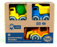 Scoop it! Mix it! Dump it! Just another earth-moving, earth-saving day at the job site for the Green Toys™ Construction Trucks! Made in the USA from 100% recycled plastic with no BPA, phthalates or PVC, the fleet includes 1 Scooper with a moveable front-loader, 1 Mixer with a revolving drum, 1 Dumper with a classic open-box bed, and 1 Construction Dog character that fits in all three trucks! Perfect in a sand box, toy box, or gift box, these pint-sized trucks are just right for little hands, and can easily be tossed in a diaper bag for on-the-go fun. Built to last with no metal axles, these vehicles are made safe for children and the earth they play on.