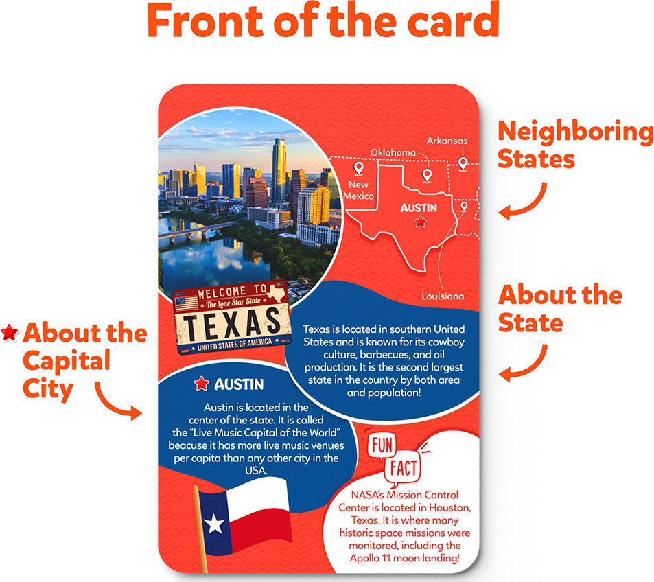 • The states on the map and the corresponding state cards are color-coded, making it easy for children to locate and learn about the States of America and their capitals.