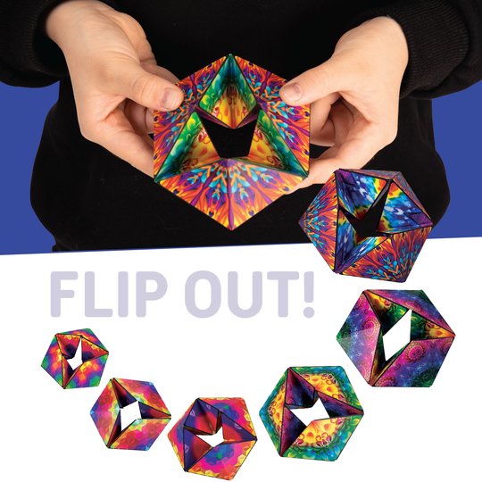 New toy alert! Karmagami flips infinitely. Each one rotates and transforms seamlessly into 4 colorful designs like a kaleidoscope. It helps calm the mind and is great for kids and adults who constantly fidget with their hands.