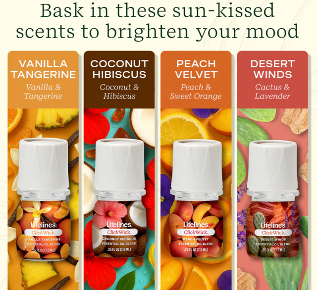Escape into sunshine with the Lifelines Sun-Kissed Escape ClickWick Collection. This 4-pack of essential oil blends is designed exclusively for Lifelines ClickWick Diffusers—Candle, Plant, or Shower. Featuring four vibrant scents—Coconut Hibiscus, Peach Velvet, Vanilla Tangerine, and Desert Winds—each bottle transforms your space into a feel-good sensory retreat. Just click into your diffuser and enjoy up to 180 days of mood-boosting aroma. Made with pure essential oils and sustainably sourced botanicals, ClickWick blends are free from parabens, phthalates, and dyes. Let Lifelines help you create moments of calm and joy, effortlessly.