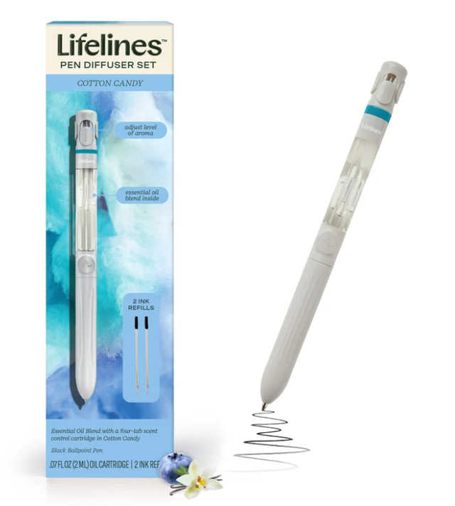 Lifelines Pen Diffuser in Cotton Candy: Immerse yourself in an aroma writing experience with this pen that diffuses the light, sugary scent of cotton candy. Notes of blueberry and spun sugar bring back sweet memories. Includes 1 pen and 2 ink refills. Long-Lasting Ink & Scent: Diffuses a unique Essential Oil Blend featuring Indian davana essential oil, with natural fragrances of blueberry, spun sugar, vanilla, and grape. Includes 2 ink refills so you can activate your senses for as long as you write.
