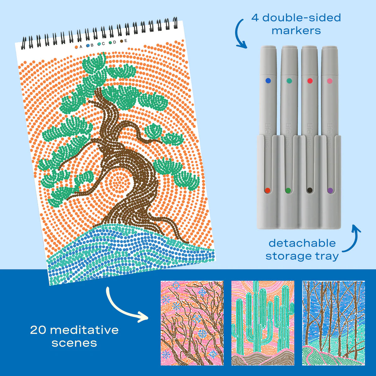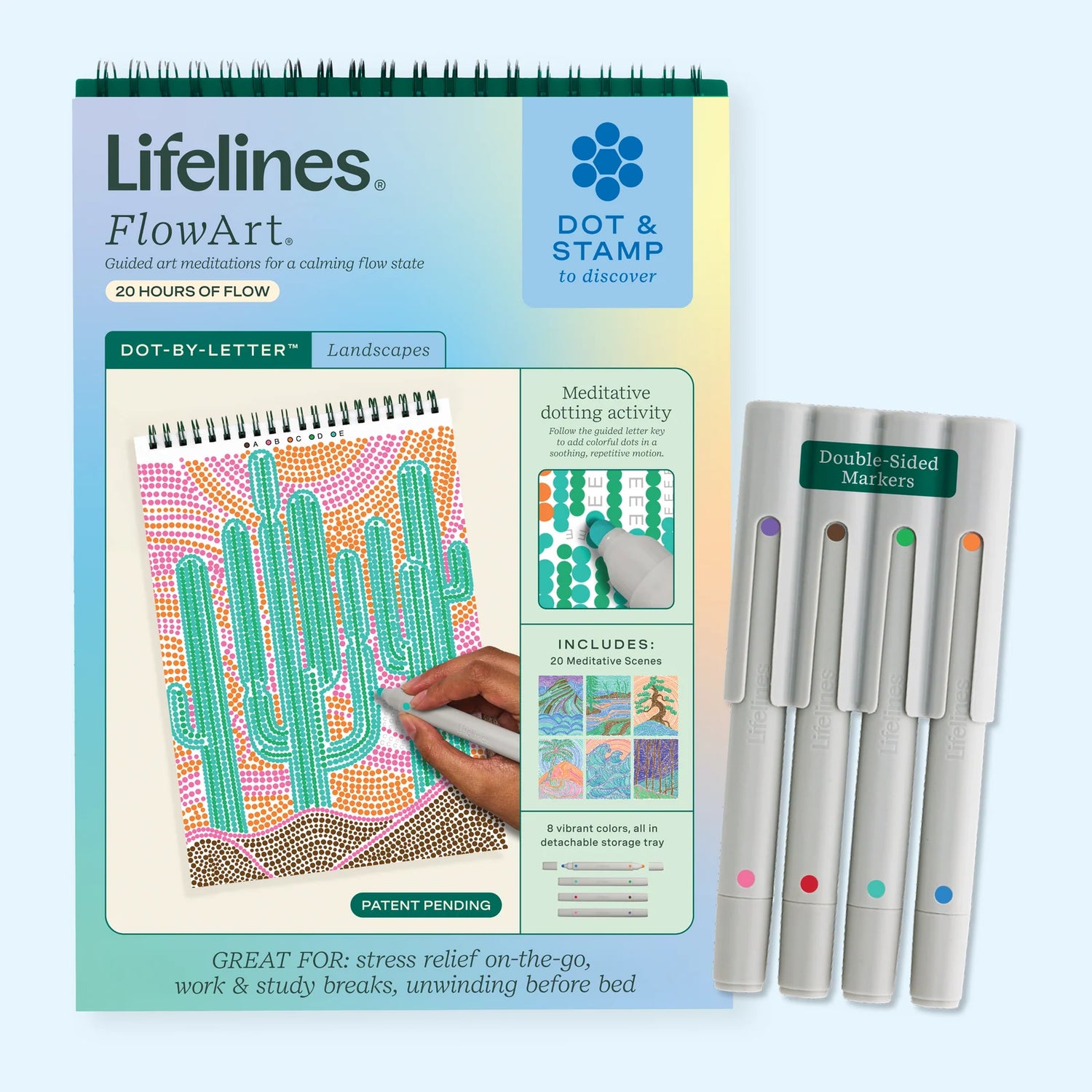 Lifelines FlowArt Pads are guided art meditations designed to help you achieve a calming flow state. Each scene is thoughtfully crafted to encourage repetitive, relaxing movements, promoting mindfulness and reducing stress. Dot-by-Letter includes 20 meditative scenes and four double-sided markers in a detachable storage tray. Engage in a meditative dotting activity using a guided letter key to fill the page with vibrant dots, creating beautiful landscape scenes. Simply match the colors to the letters, and let the rhythmic motion of dotting bring you a sense of calm. Compact and portable, this pad is perfect for calming your mind on-the-go, unwinding before bed, or taking a work or study break to de-stress.