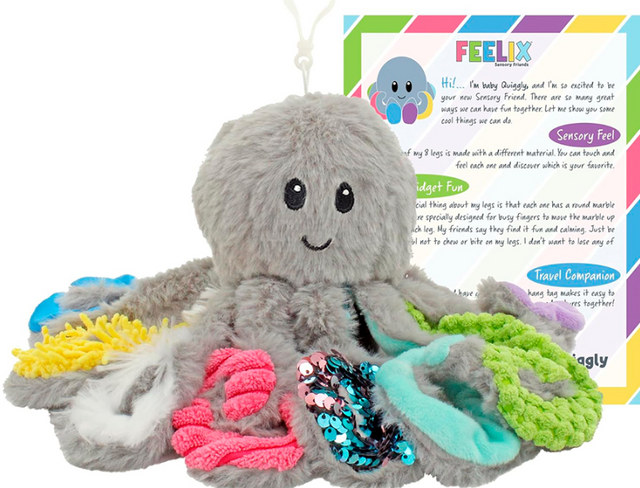 Machine washable, embroidered with a friendly face, and complete with a travel clip, the Mini Quiggly Sensory Octopus is your new best friend in sensory play, wherever you go.