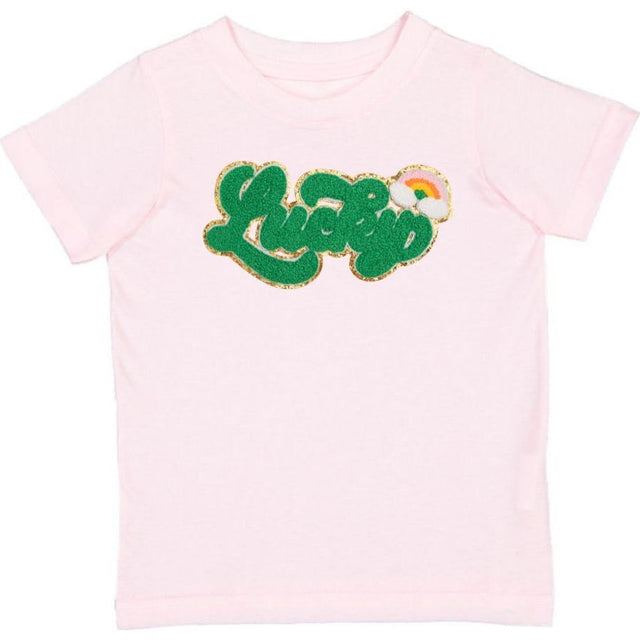 The Lucky Rainbow Patch St. Patrick's Day Short Sleeve T-Shirt is a fun and festive t-shirt for kids celebrating St. Patrick's Day! Shirt Color: Ballet Pink, Patch Color: Multicolor chenille with gold glitter outline. Features: Tagless inside neck label for an itch-free wear. Fit: Unisex; True to Size. Each t-shirt is hand pressed with love using baby and child safe inks.
