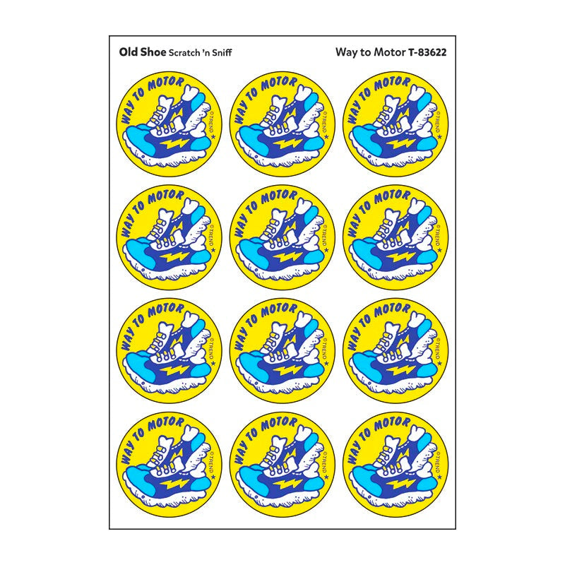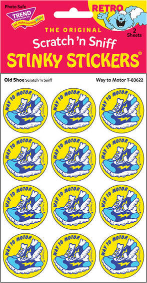 - Get a whiff of this Way to Motor, old shoe-scented sticker! TREND Scratch 'n Sniff Stinky Stickers® from the '80s are BACK! And they're SCENT-sational! Fun to collect, trade, and celebrate accomplishments and special occasions. Collectors will be happy to spot the ★ to distinguish TREND Retro Stinky Stickers® from those printed in the 1980s.